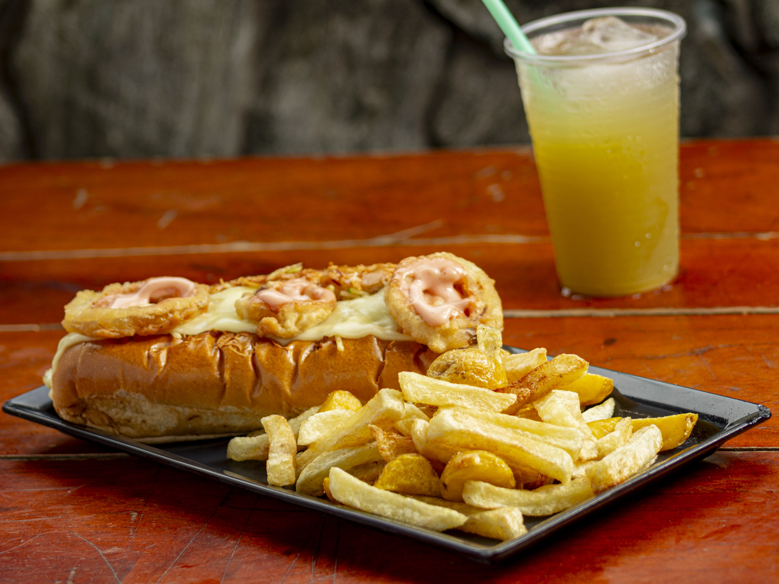 Salchicha americana, queso doble crema, aros de cebolla apanados, queso cheddar, queso crema, ripio de papa, salsas.