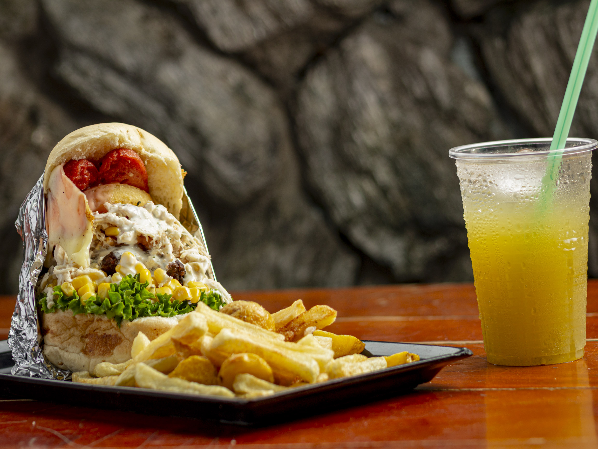 150 g De carne, salchicha ranchera, chorizo paisa, crema de queso cheddar, filete de pechuga, tocineta, queso doble crema, papa chip, tomate, lechuga, cuadros de piña y salsa de la casa, acompañada de papa a la francesa o papa amarilla.