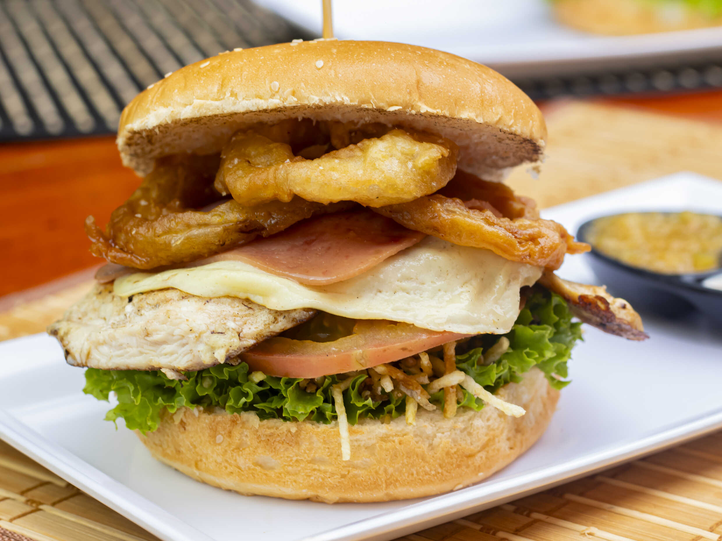 150 g De filete de pechuga, pepinillos, crema de queso cheddar, aros de cebolla, tocineta, queso doble crema, papa chip, tomate, lechuga y salsa de la casa, acompañada de papa a la francesa o papa amarilla.