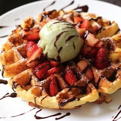 Clasico Waffle con Fresa, Helado y Salsa Hersheys
