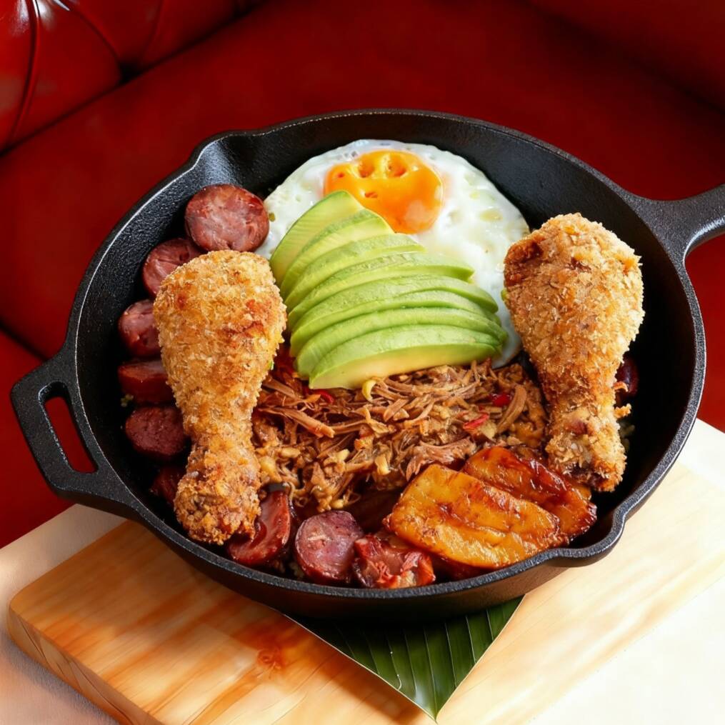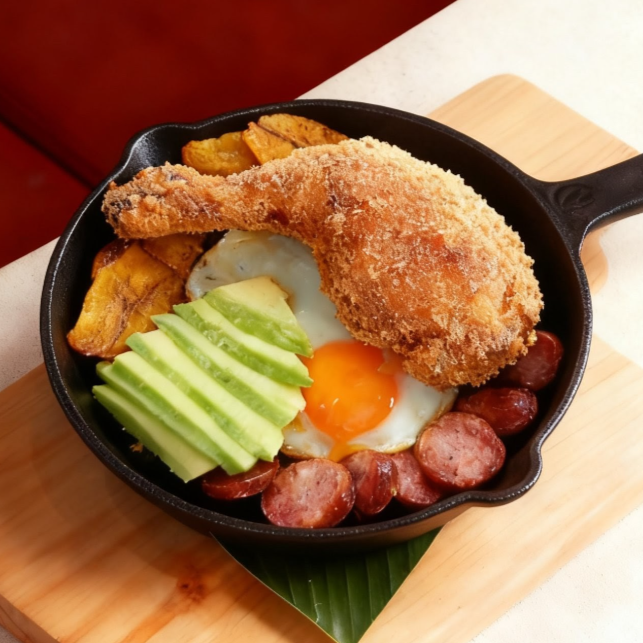 Esta exquisitez contiene (300 GR) de arrocito con frijol, papa y chicharroncito mezclado, tajadas de maduritos, (2) huevos fritos, (2) chorizos artesanales de la casa, (3) muslos de pollo crispys, mini arepitas de maiz pelao y la infaltable porcion de aguacate.
