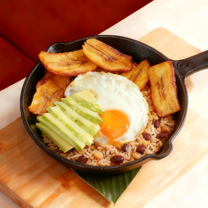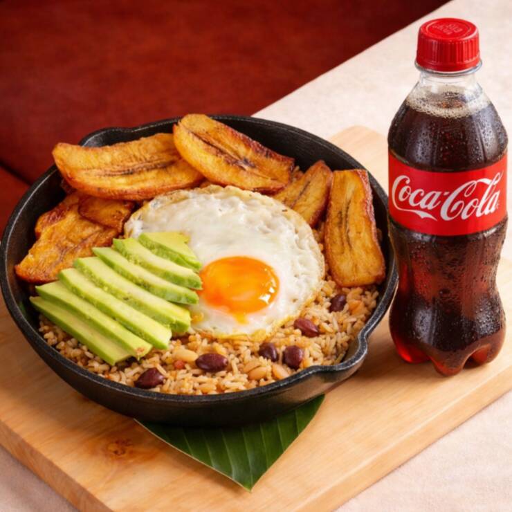Base de frijoles y arroz de fideos bien mezclado, coronado con huevo frito acompañado con maduritos. (incluye bebida)