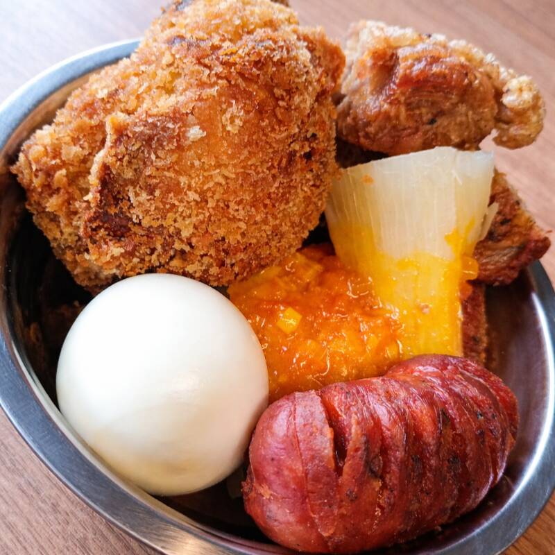 Contiene (1) pierna pernil crispymente apanada, acompañada de maduritos de tajadas, (2) huevos fritos, (1) chorizo artesanal de la casa y (200 gr) de calentosky mezclado con arrocito, frijol, papa y chicharron.