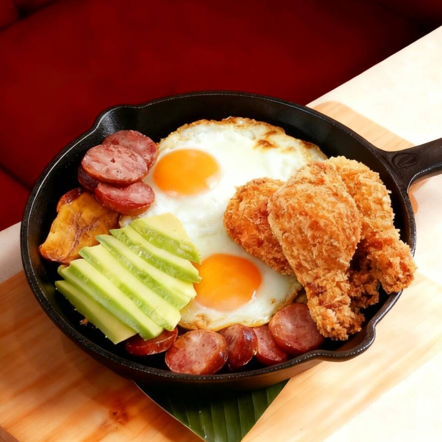 Esta ricura contiene (200 gr) base mezclada con arrocito, frijol, papa y chicharroncito, (2) huevos fritos, (2) alitas de pollo crispy, tajadas de maduritos y la infaltable porcion de aguacate.
