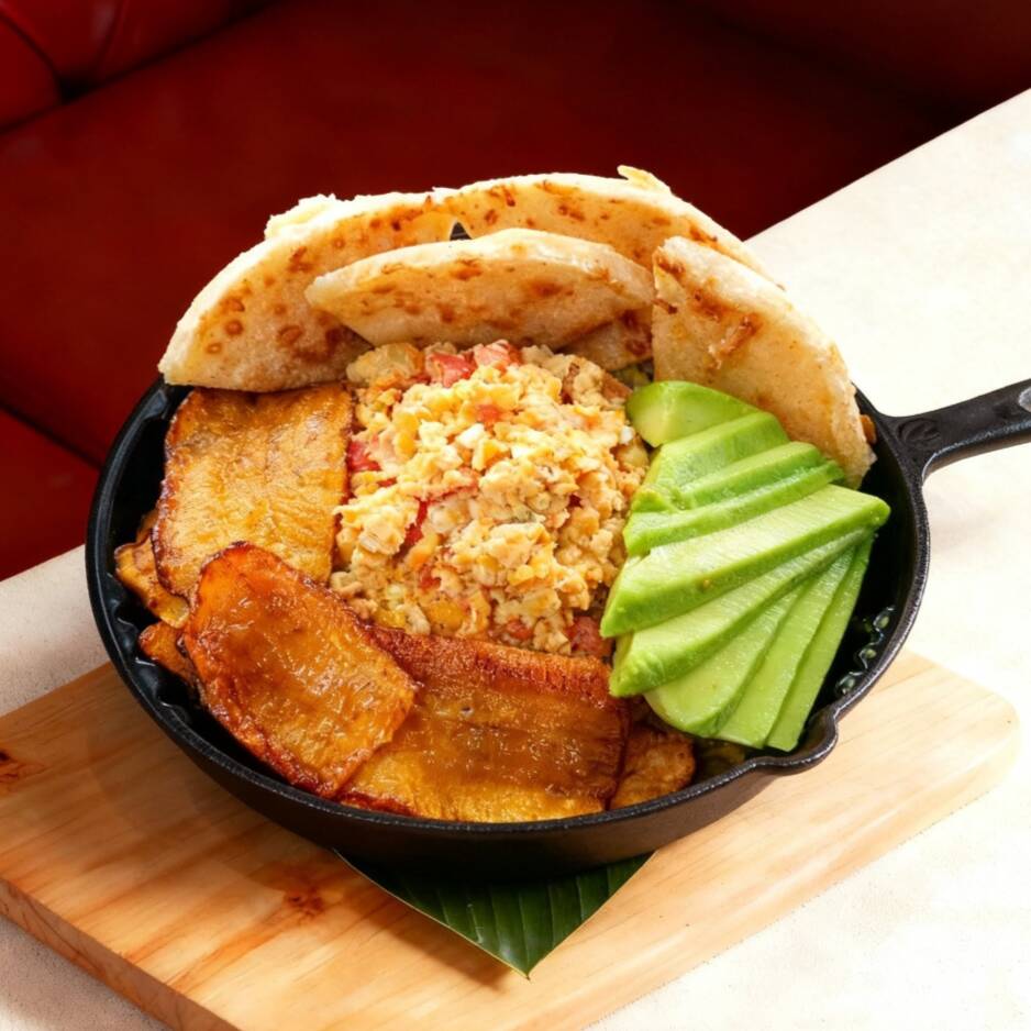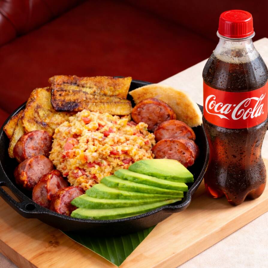 Este manjar contiene (2) huevos pericos, maduritos en tajadas, (2) trocitos de arepita blanca, (200 gr) de arrocito mezclado con frijolito, papa. y chicharroncito sin dejar atrás la infaltable porcion de aguacate.