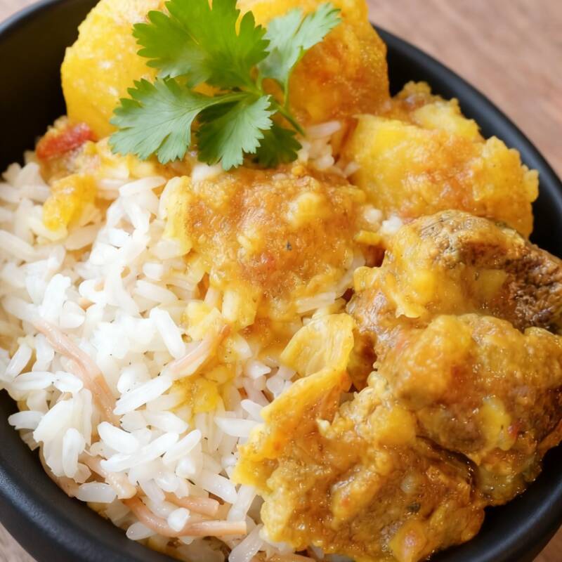 Carnecita sudada con arroz de palitos y papita.