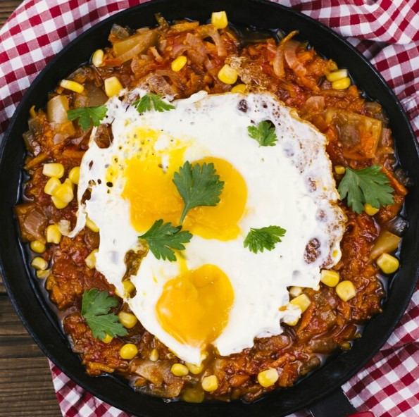 Huevos en omelett rellenos de tocineta, hogao, queso y maíz, acompañado de arepa, fruta y naranjada.
