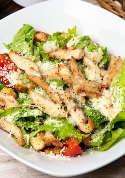 Mix de Lechuga con pollo desmechado en salsa de la casa con crotones de pan , aguacate ,queso parmesano en camado en pechuga asada en tiras.
