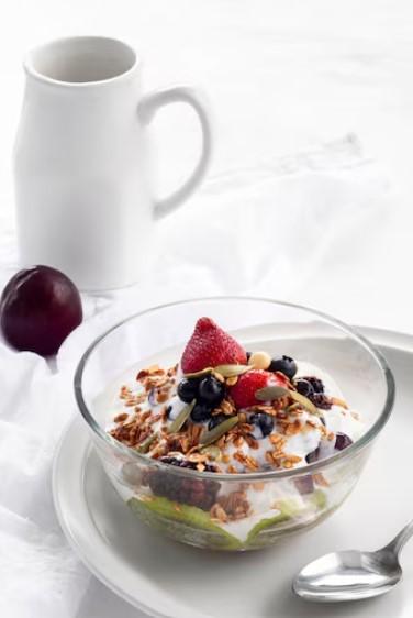 Mezcla de yogurt griego, fruta y granola.