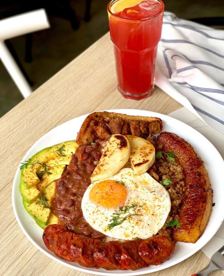 Arroz blanco, huevo frito, carne molida, frijoles, chicharrón, chorizo artesanal, maduro almibarado, aguacate y bebida de la casa de 12 oz por cortesía. (Porción personal)