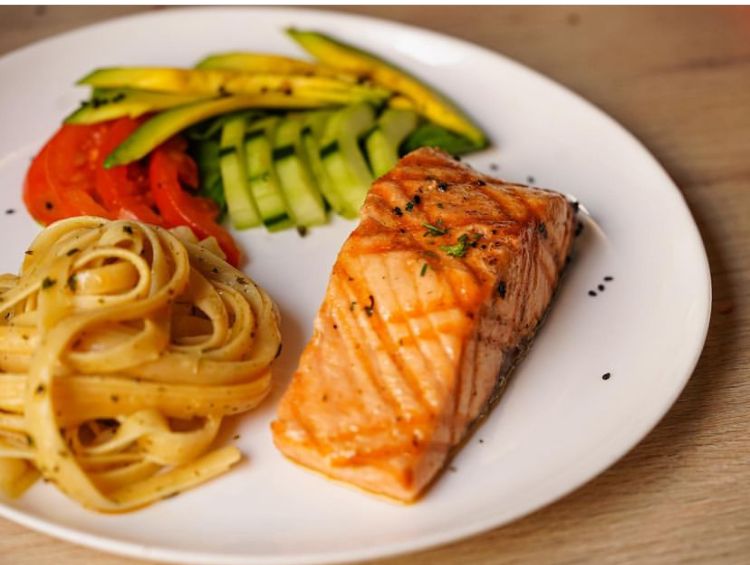 Salmón 190 g aproximadamente a la parrilla con piel, acompañado de pasta al burro y ensalada de lechuga, tomate, pepino y aguacate.
