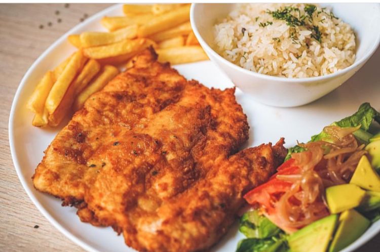 Filete de pechuga de pollo en apanado de la casa, acompañado de papa a la francesa, arroz y ensalada de lechuga, tomate, pepino y aguacate.