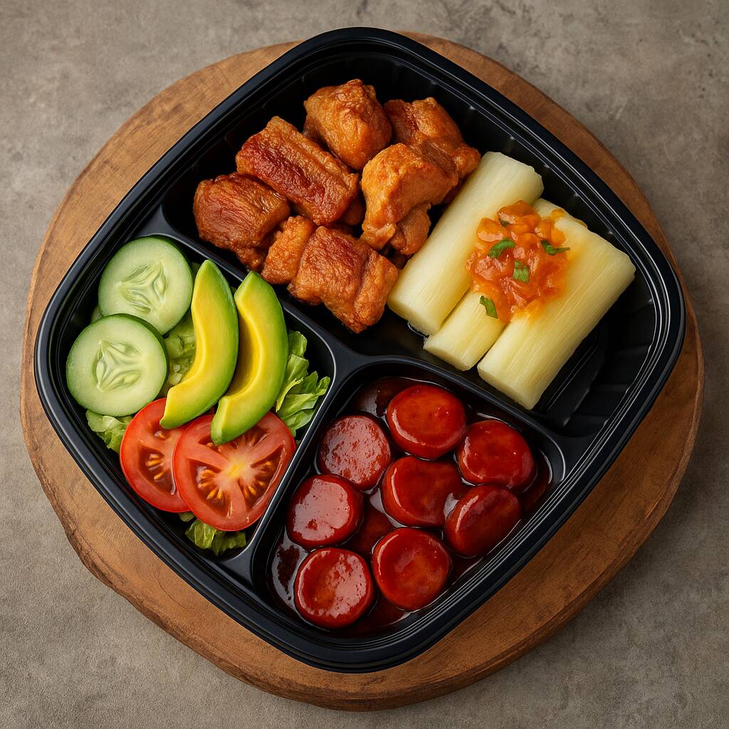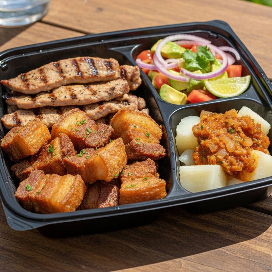 Chicharron carnudo crocante, costillita de cerdo al horno, chorizo de cerdo en moneditas, lomo de cerdo a la parrila, maduro en medallones, yuca al vapor y vegetales