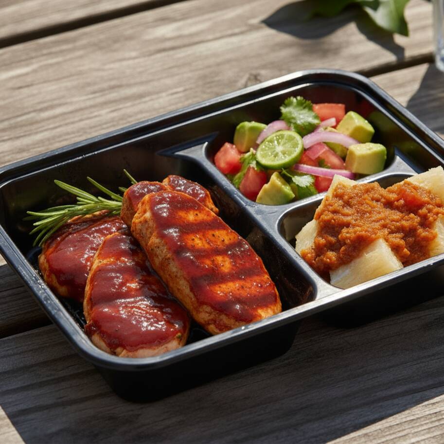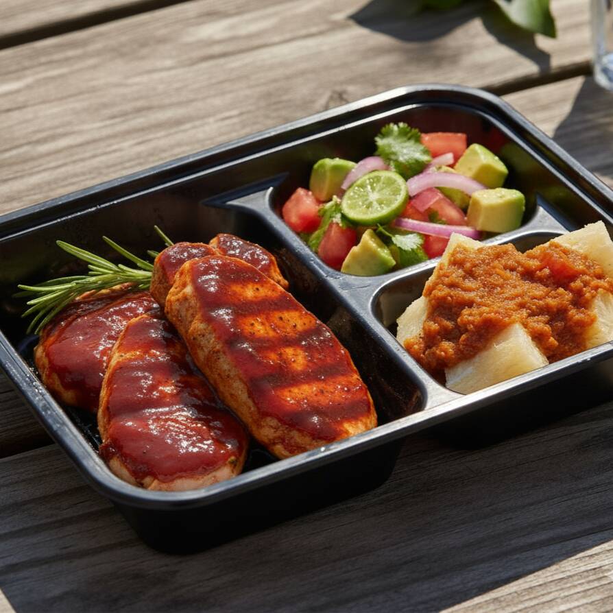 300 Gramos de delicioso lomo de cerdo ahumado bañado en salsa bbq, acompañado de yuca al vapory salsas.