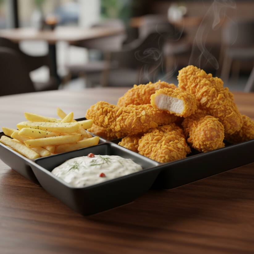 Deliciosos trozos de pechuga crispy natural, papa crocante a la francesa y salsa tártara