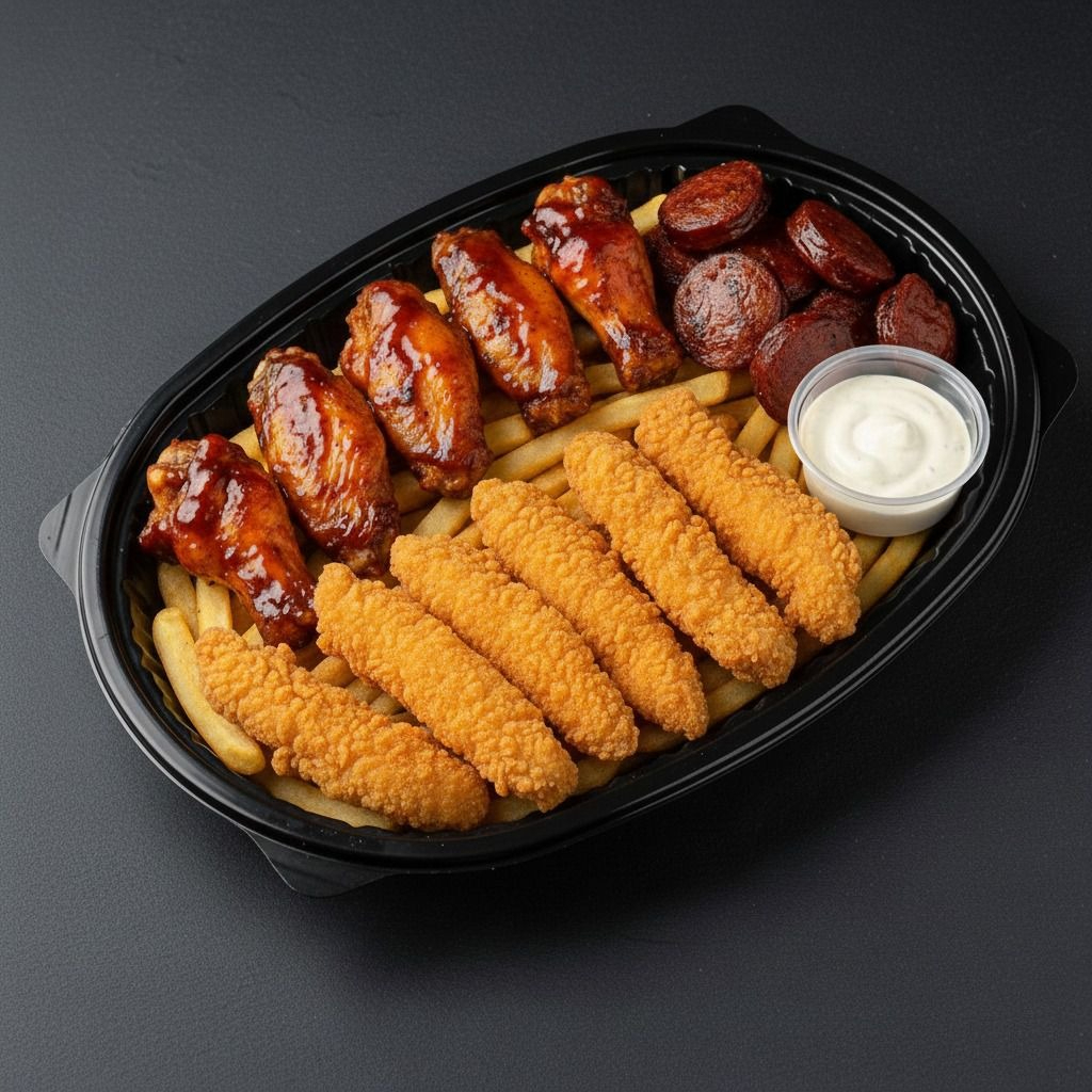 6 Piezas de alitas crocantes bbq, tiras de pechuga jugosa apanada, chorizo caramelizado, papa francesa, salsas.