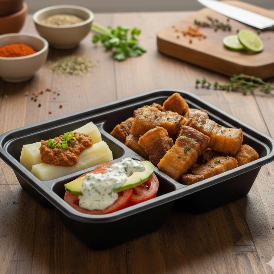 Deliciosos chicharron carnudo crocante en trozos, chorizo bbq, yuca al vapor y vegetales