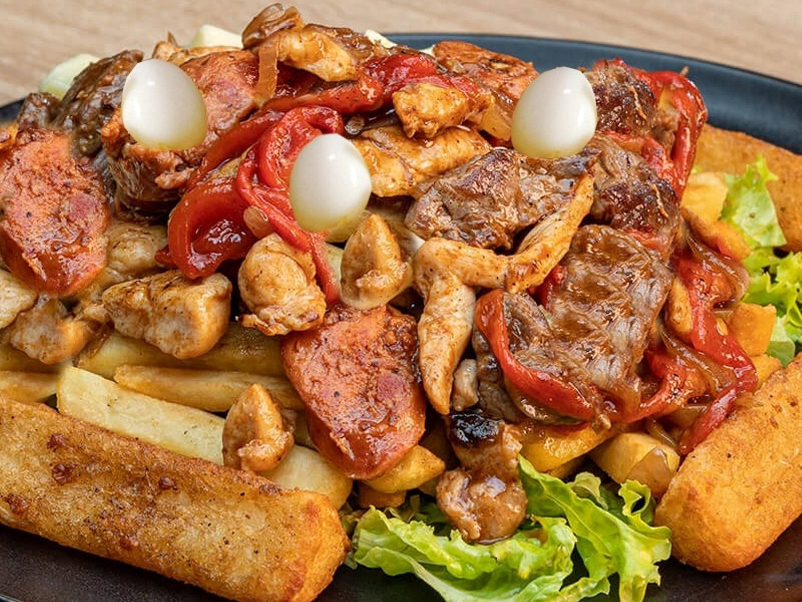 Papa crocante, bocados de pechuga a la parilla, chicharron carnudo en tiras, chorizo caramelizado, queso tajado, papa fosforito y salsas