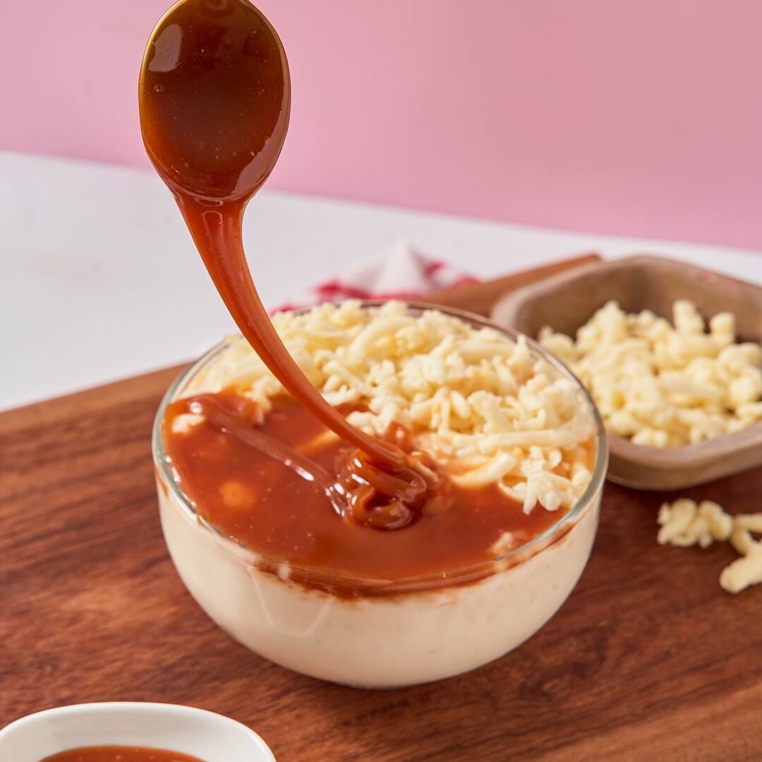 Suave y cremoso arroz con leche bañado en nuestra salsa artesanal de caramelo salado con porción de queso doble crema.