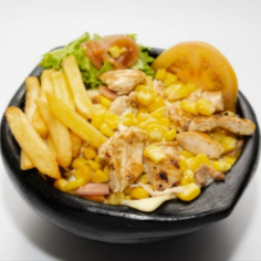 Chorizo paisa, pollo desmechado bañado en salsa de la casa, crema de queso cheddar, carne desmechada, maíz tierno, queso doble crema, tocineta, papa chip, cebolla grillé, cuadros de piña y salsa de la casa, acompañado de papa a la francesa o papa amarilla.