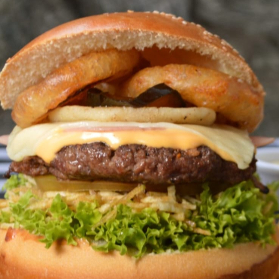 Hamburguesa pan tipo hamburguesa, 90gr de carne, quedo cheddar, aros de cebolla, pollo desmechado, papas chips, tocineta, lechuga, cebolla, tomate, salsas de la casa, porción de 150 gr de papa amarilla, 150 gr papa a la francesa y bebida del día (12 onzas) Plato personal.