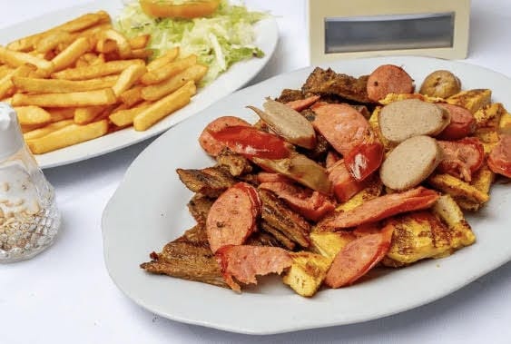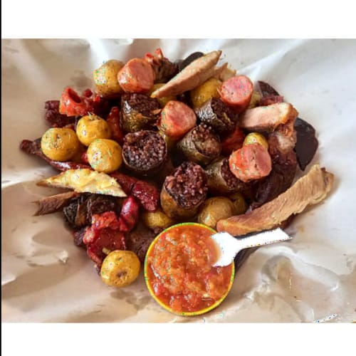 carne pollo cerdo chorizo carne oreada sobrebarriga arepa de maiz papa criolla aji y tartara