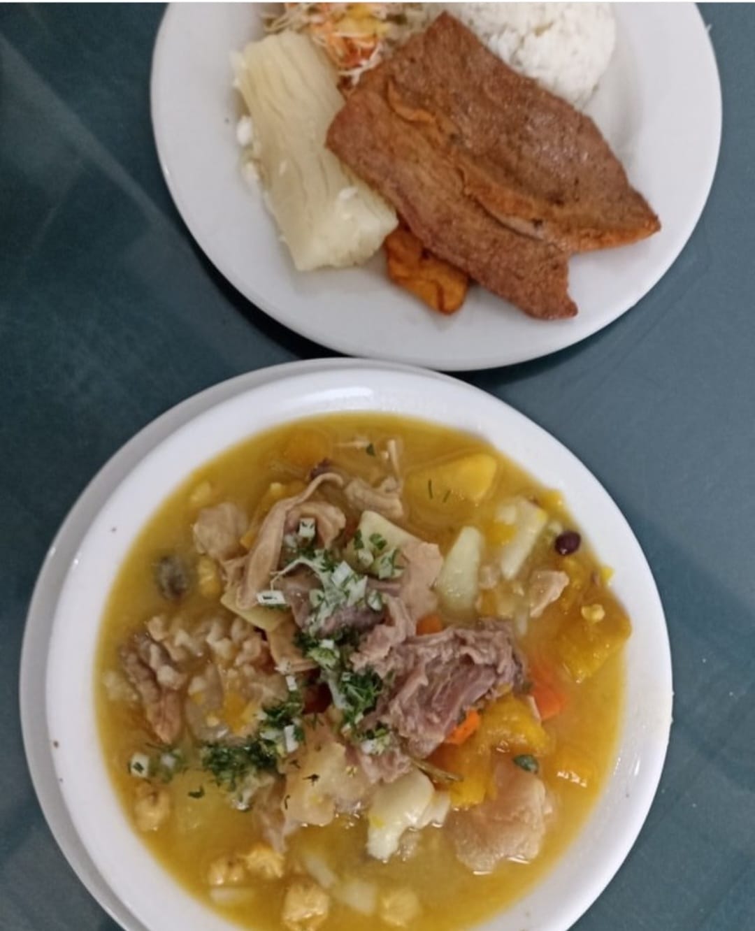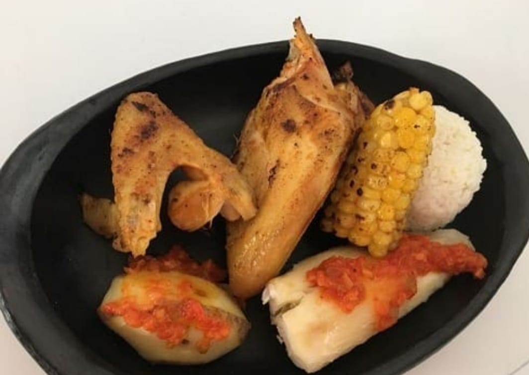 pierna pernil o pechuga con arroz papa yuca mazorca y consome de gallina