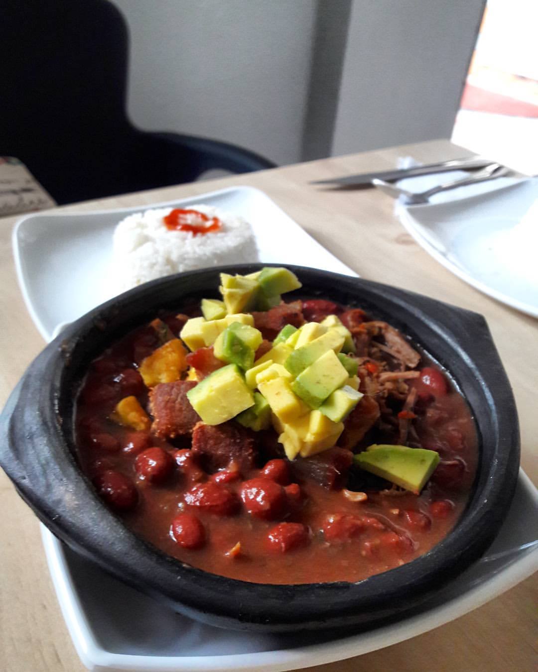 frijol rojo agucate chicharron carne desmechada con patacon y arroz
