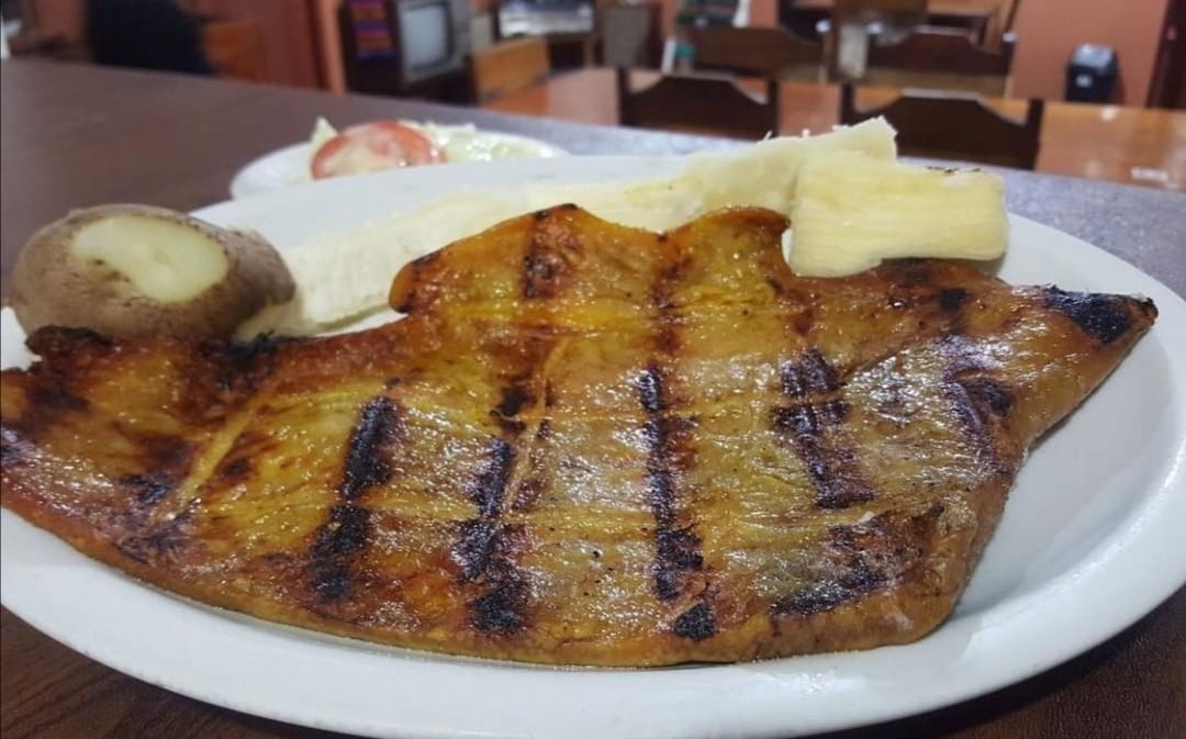 300 Gramos de sobre barriga asada, arroz blanco, yuca, ensalada de cebolla y tomate.