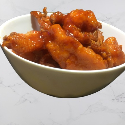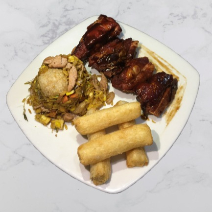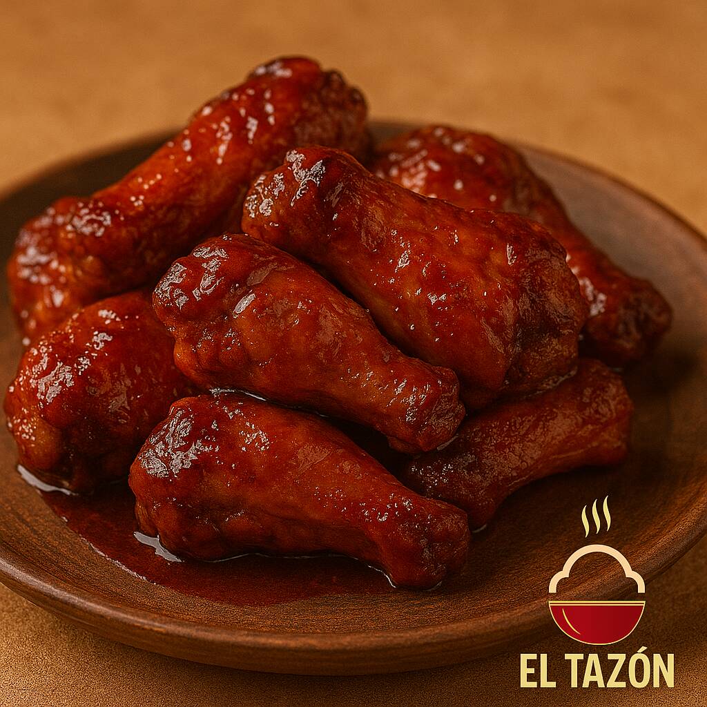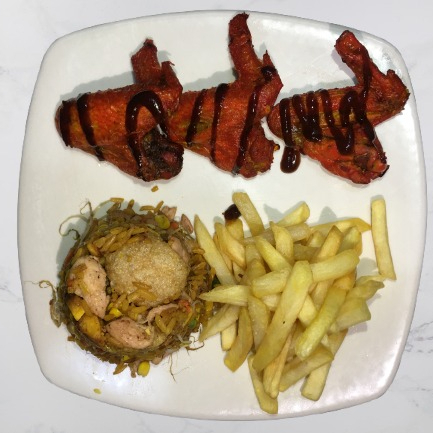 3 alitas bañadas en salsa bbq acompañado de 300gr de arroz criollo con papas a la francesa o yuca frita
