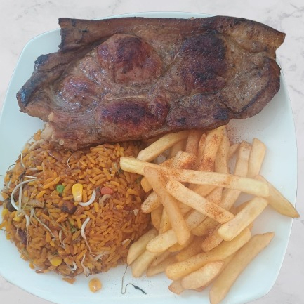 chuleta de cerdo asada acompañada de arroz criollo con papas a la francesa o yuca frita