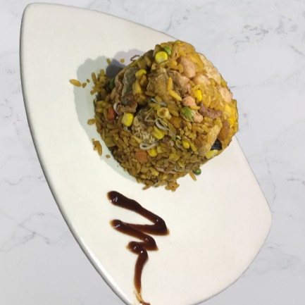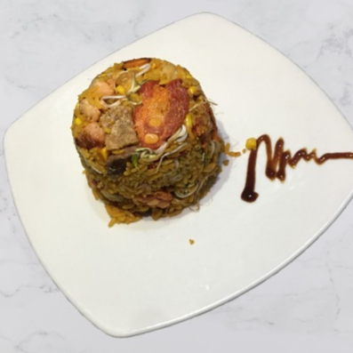 delicioso arroz que contiene: pollo; cerdo, jamón y raíces acompañado de pollo frito