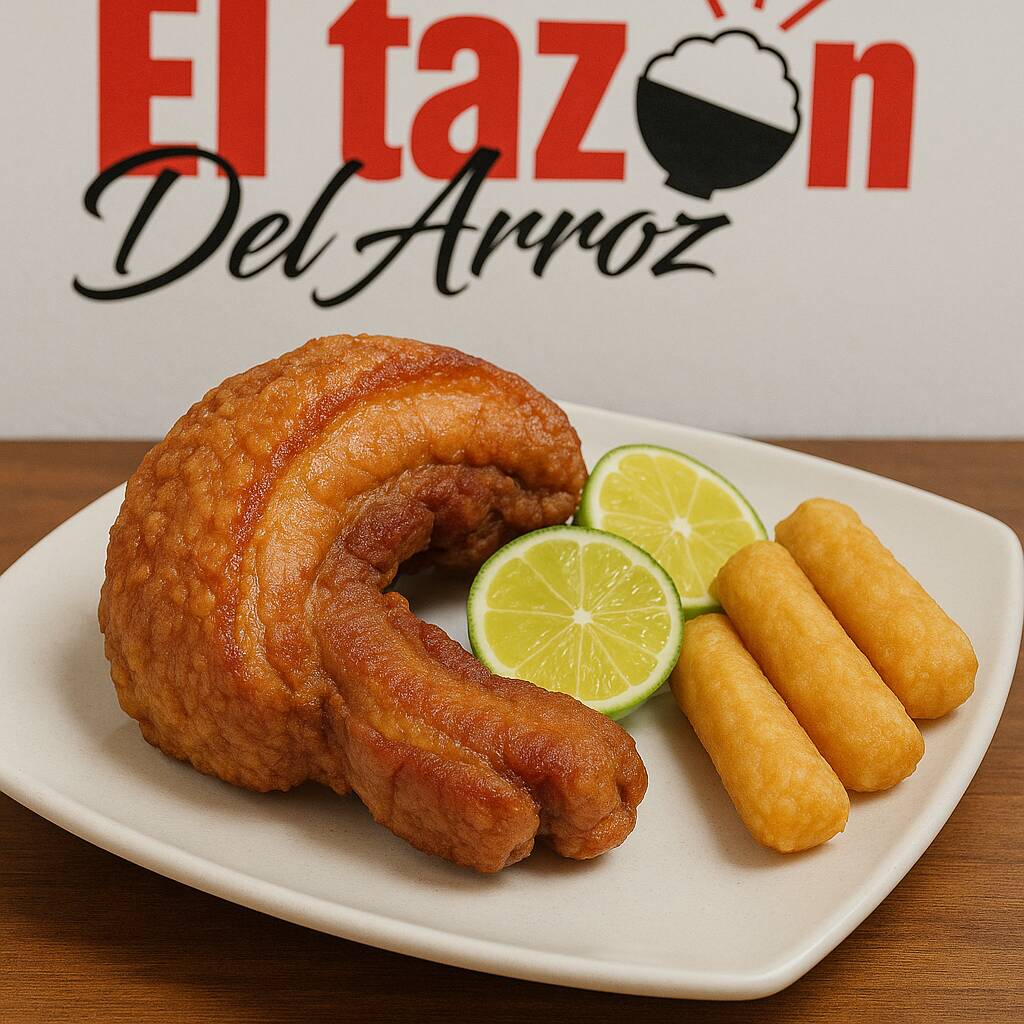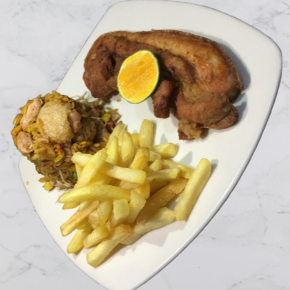 chicharrón frito acompañado de arroz criollo con papas a la francesa o yuca frita