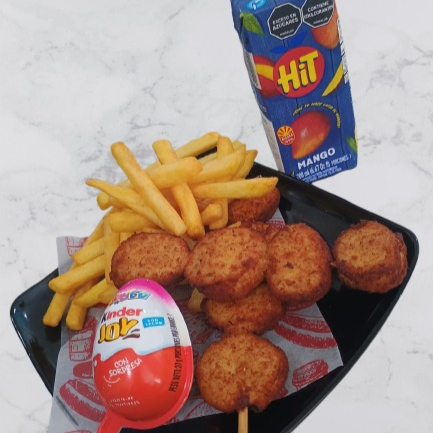 trozos de pechuga apanados acompañados de papas a la francesa un jugo hit de 200 ml y un huevo sorpresa