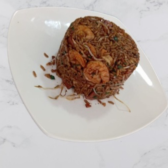 delicioso arroz que contienen trozos de pollo, cerdo, jamón camarones y raíz