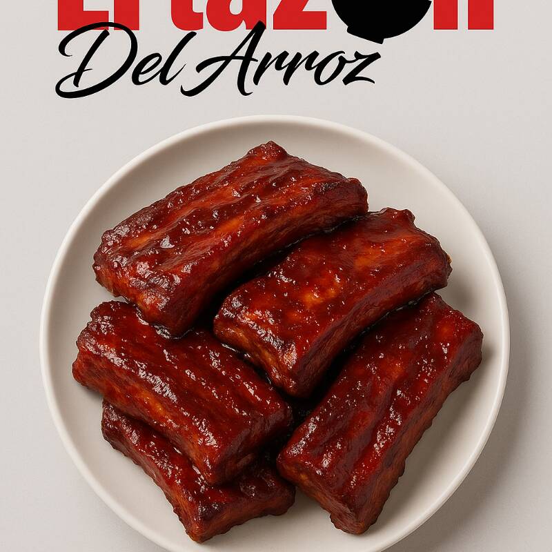costillas de cerdo bañadas en salsa bbq acompañadas de arroz criollo con papas a la francesa o yuca frita