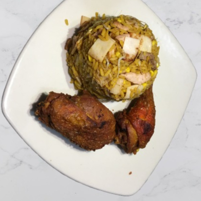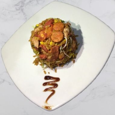 delicioso arroz que contiene: pollo, cerdo, chicharron, plátano maduro, verduras y raices