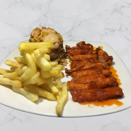 trozos de pechuga apanados y bañados en salsa agridulce acompañados de arroz criollo con papas a la francesa o yuca frita