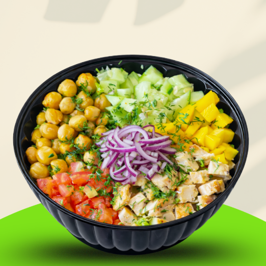 Ensalada con: mix de lechugas, pechuga a la plancha, garbanzos, pepino, cebolla roja, mango en cubos, tomate, cilantro y salsa de aguacate. bowl de 24 onzas