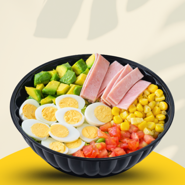Ensalada con: mix de lechugas, jamón en tiritas, tomate en cuadros, aguacate en cuadros, maíz dulce, huevos de codorniz o pechuga a la plancha y salsa tártara. bowl de 24 onzas