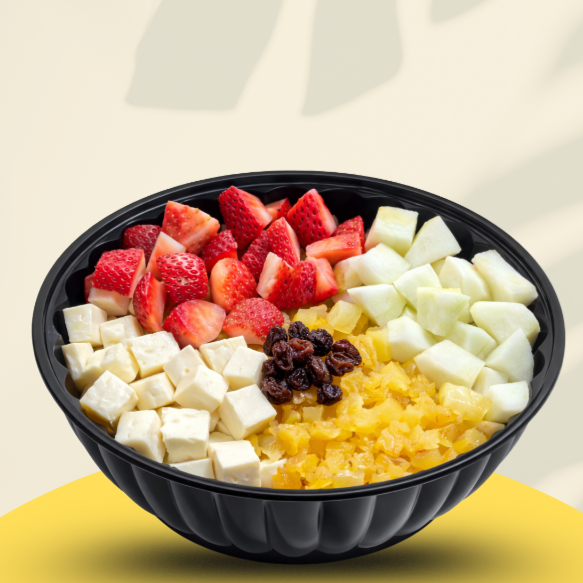 Ensalada con:mix de lechugas, piña caramelizada, fresas, manzana, uvas pasas, queso en cubitos y salsa de yogurt. bowl de 24 onzas