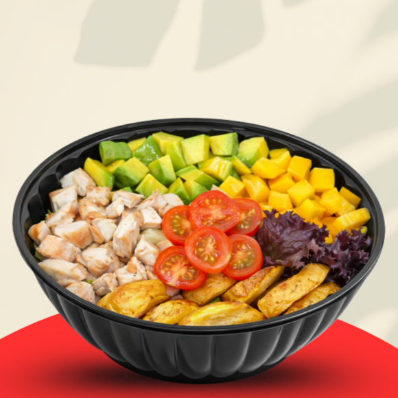 Ensalada con: mix de lechugas, aguacate, papa criolla, tomate cherry, mango, pechuga a la plancha y salsa tártara. bowl de 24 onzas