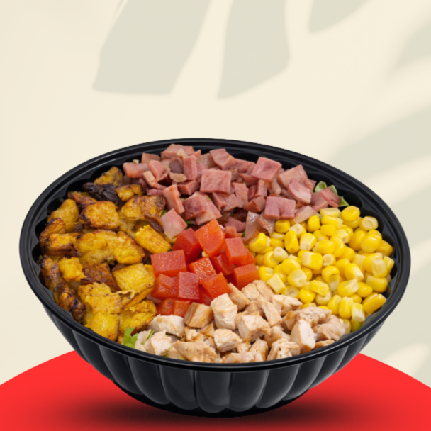 Ensalada con: mix de lechuga, bocadillo veleño, maíz dulce, tocineta, maduro asado, queso o pechuga y salsa de queso crema. bowl de 24 onzas
