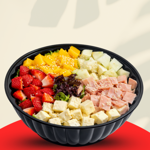 Ensalada con: mix de lechuga, mango, jamón, queso, manzana, fresas, semillas de ajonjolí y salsa de yogurt. bowl de 24 onzas