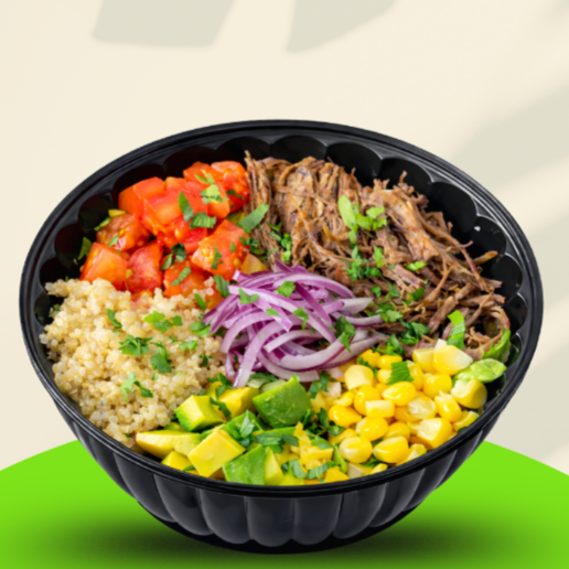 Ensalada con: mix de lechugas, carne desmechada o pechuga, tomate, aguacate, maíz dulce, cebolla, quinua, cilantro y salsa de aguacate. bowl de 24 onzas
