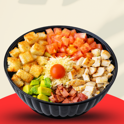 Ensalada con: mix de lechugas, pechuga a la plancha, crotones de pan, tomate en cubos, tomate cherry, queso, tocineta, aguacate y salsa césar. bowl de 24 onzas