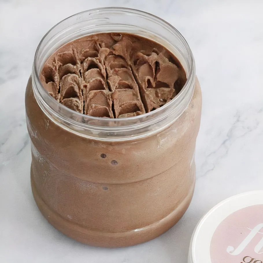 Postre di gelato vegano de chocolate con avellana, endulzado con stevia y elaborado con leche de almendra.