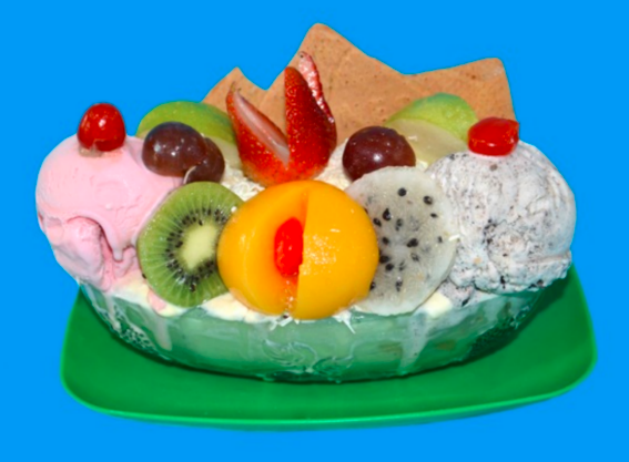 Mango, banano, fresa, papaya, melon, manzana, crema de leche, queso, coco, helado, cerezas y galletas.
