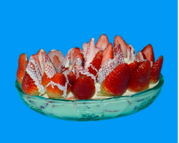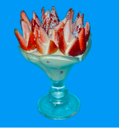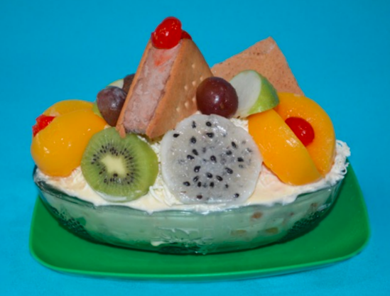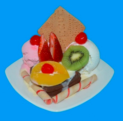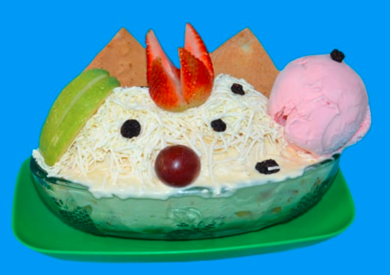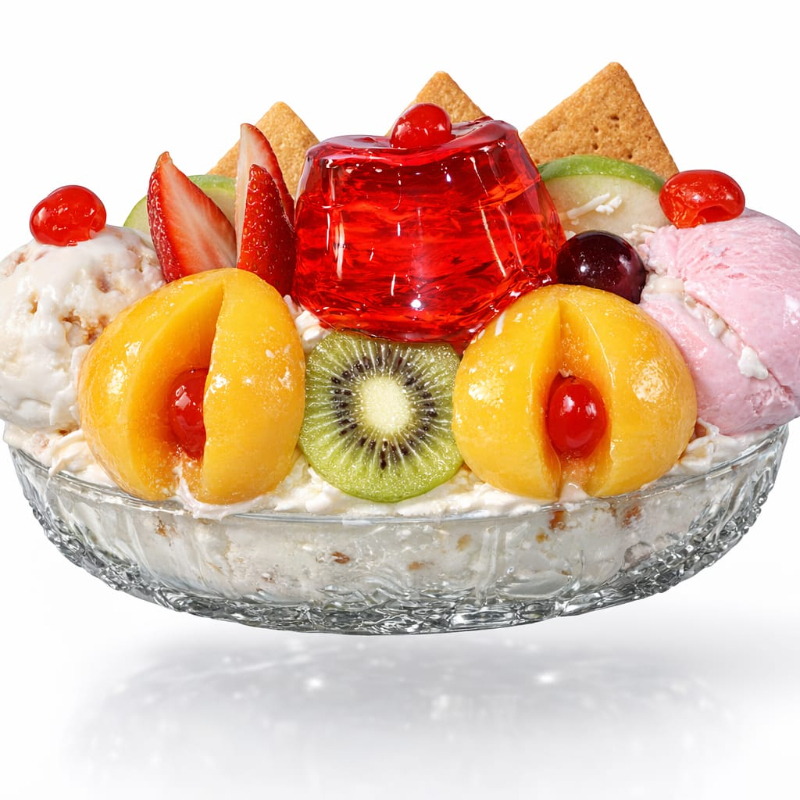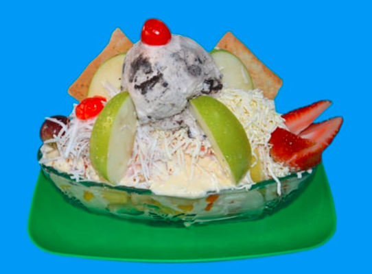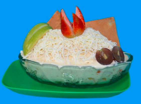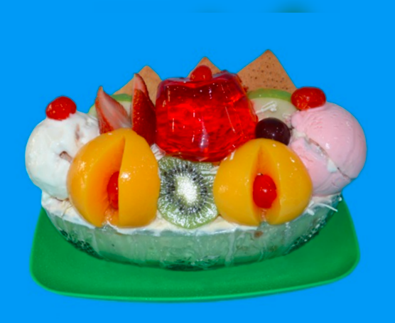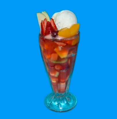 Banano, fresa, mango, papaya, melón, manzana, crema de leche, queso, 2 bolas de helado, kiwi, durazno, uva, cerezas, gelatina y 2 galletas.