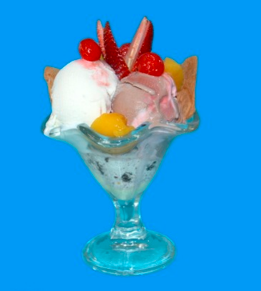 4 bolas de helado, durazno, fresa, cerezas, galletas.